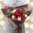 Букет красных ранункулюсов, роз и зелени