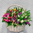 Букет ярких тюльпанов с гипсофилой
