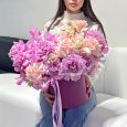 Коробка розовых французских роз и хризантем
