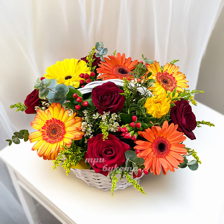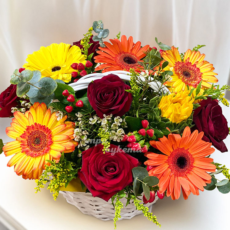 Корзина гербер и роз с зеленью