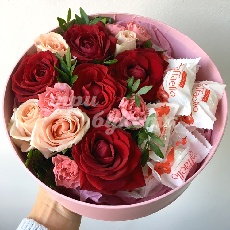 Красные розы и Raffaello в коробке