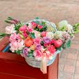 Лаванда и оранжевые розы в корзине