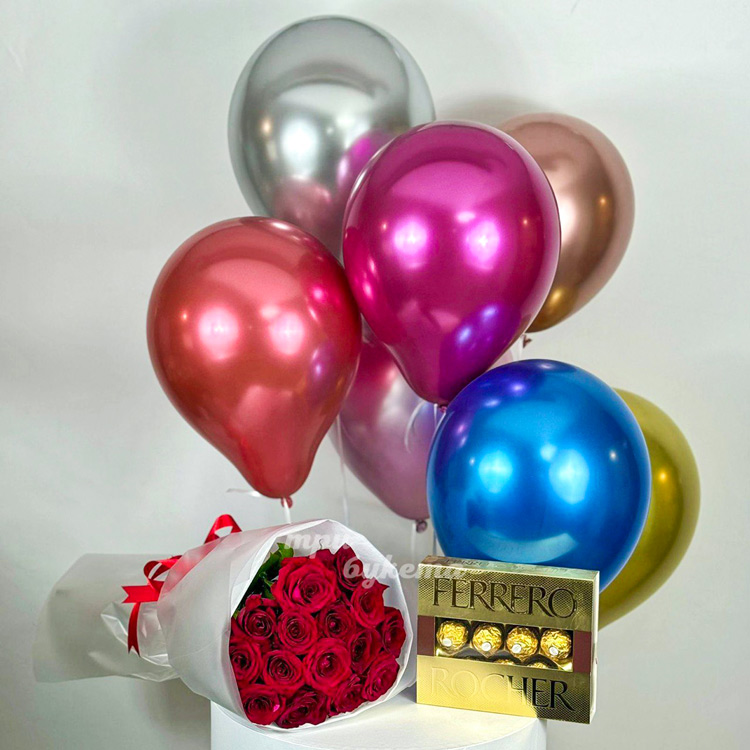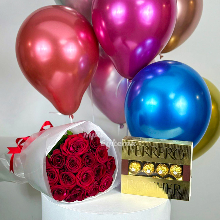 Набор из шариков, конфет и 15 красных роз