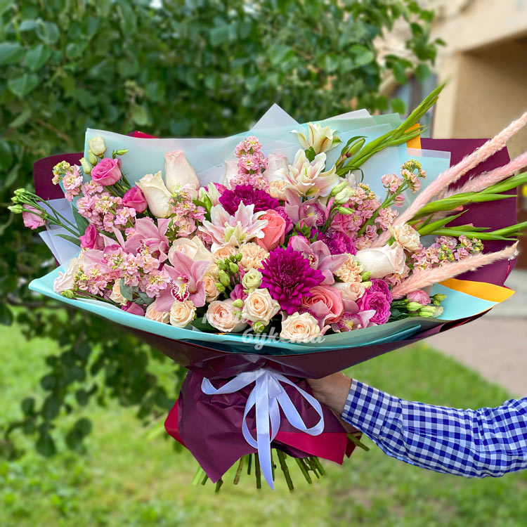 Розовый букет лилий, орхидей и маттиол
