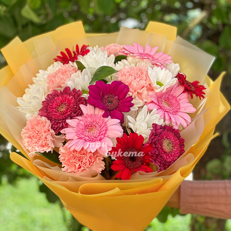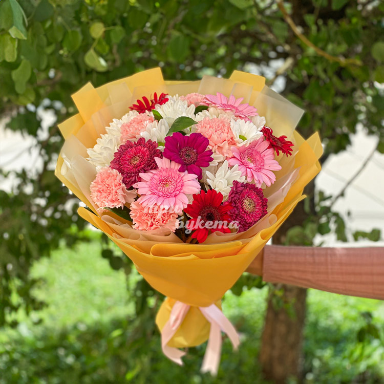 Яркий букет розовых гвоздик и гербер